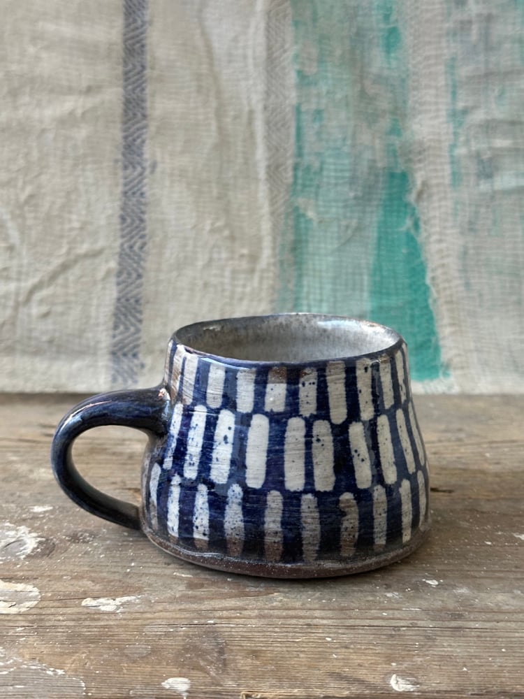8oz mug, red stoneware with cobalt wax resist design.